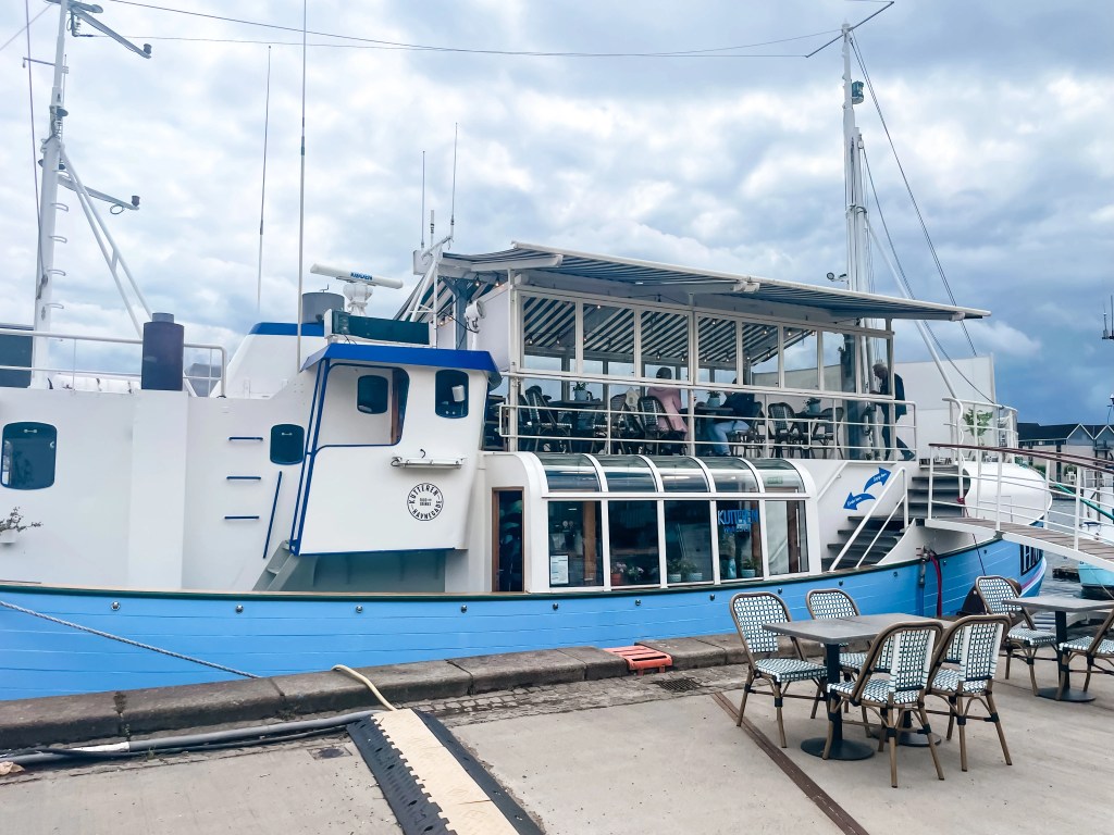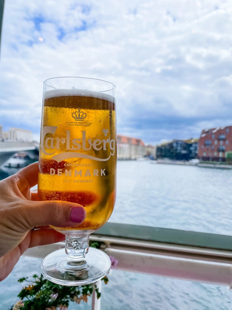 After our boat tour, we strolled about 15 minutes through the city to Nyhavn—a colorful canal lined with waterfront restaurants and houseboats. We grabbed lunch aboard Kutteren Havnegade, a cozy boat-turned-restaurant. Dining out in Denmark (and Norway) can be pricey thanks to high taxes on food and drinks, so it was interesting to see locals enjoying grocery-store lunches and single beers along the water instead.